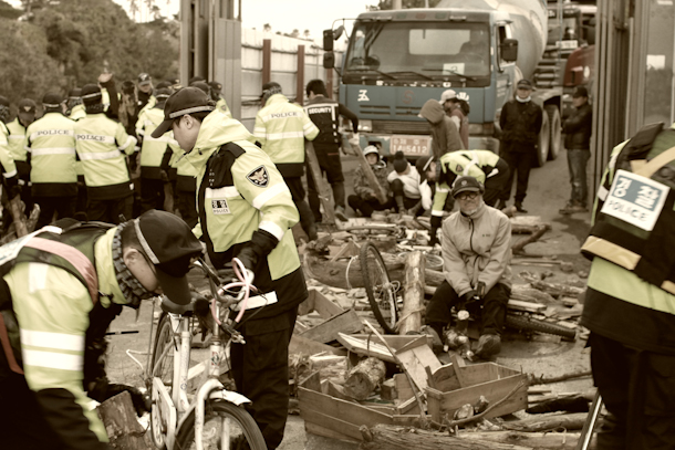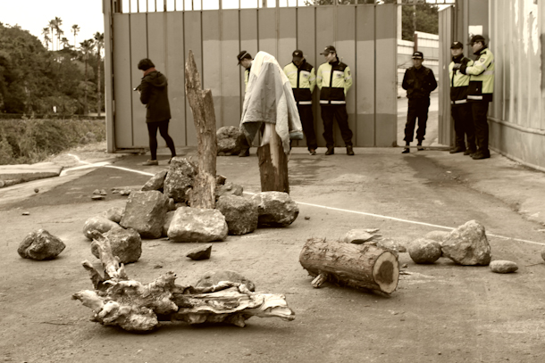 Rubble always blocks the entrance to the gate of the construction site for the US/ROK naval base